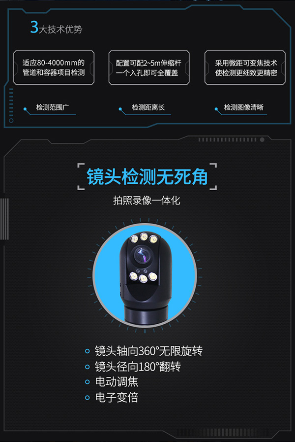 GT75BXA工業(yè)容器內(nèi)窺鏡是九泰科技自主研發(fā)、生產(chǎn)的一款便攜式的多功能容器內(nèi)窺鏡,采用高清大視角變倍調(diào)焦鏡頭,搭配2-5米(長度可定制)可伸縮性檢測桿,在只開一個入孔的情況下,將檢測范圍全部覆蓋。適用于檢測大空間及各類容器內(nèi)部視頻檢測作業(yè),鏡頭支持軸向360°無限旋轉(zhuǎn),徑向180°翻轉(zhuǎn),自動對焦、光學(xué)變倍功能使得檢測空間不受大小限制,自帶可調(diào)節(jié)亮度的環(huán)境強(qiáng)光照明,可照亮20米以上的管道/容器內(nèi)部,高清檢測畫面實時傳輸,精準(zhǔn)全面,達(dá)到真正的無死角檢測效果!