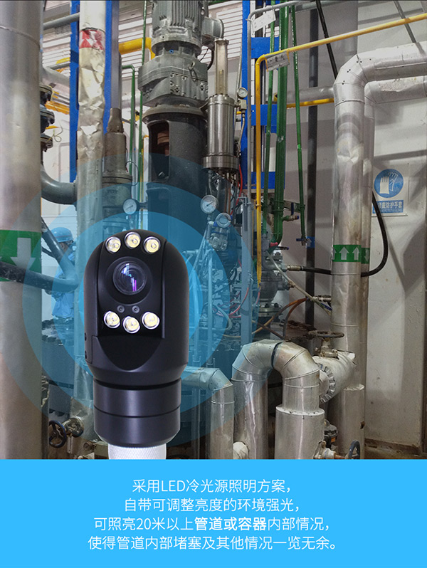 采用高亮度LED冷光源照明方案,可照亮50米以上的空間內(nèi)部情況,亮度可調(diào)節(jié),輕松應(yīng)對各種復(fù)雜檢測環(huán)境;十倍變倍功能,遠(yuǎn)距離細(xì)節(jié)一覽無余,一鍵式操作高清晰圖像實時呈現(xiàn)。